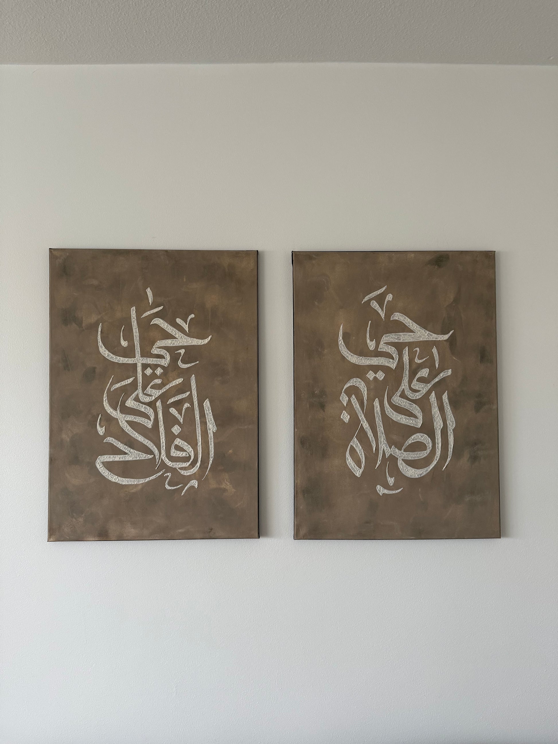 Två tavlor med texten "Hayya 'alas Salah, hayya 'alal falah" vilket är en del av den islamiska bönen (Adhan) som betyder "Kom till bönen, kom till framgång". Mått 50x70cm