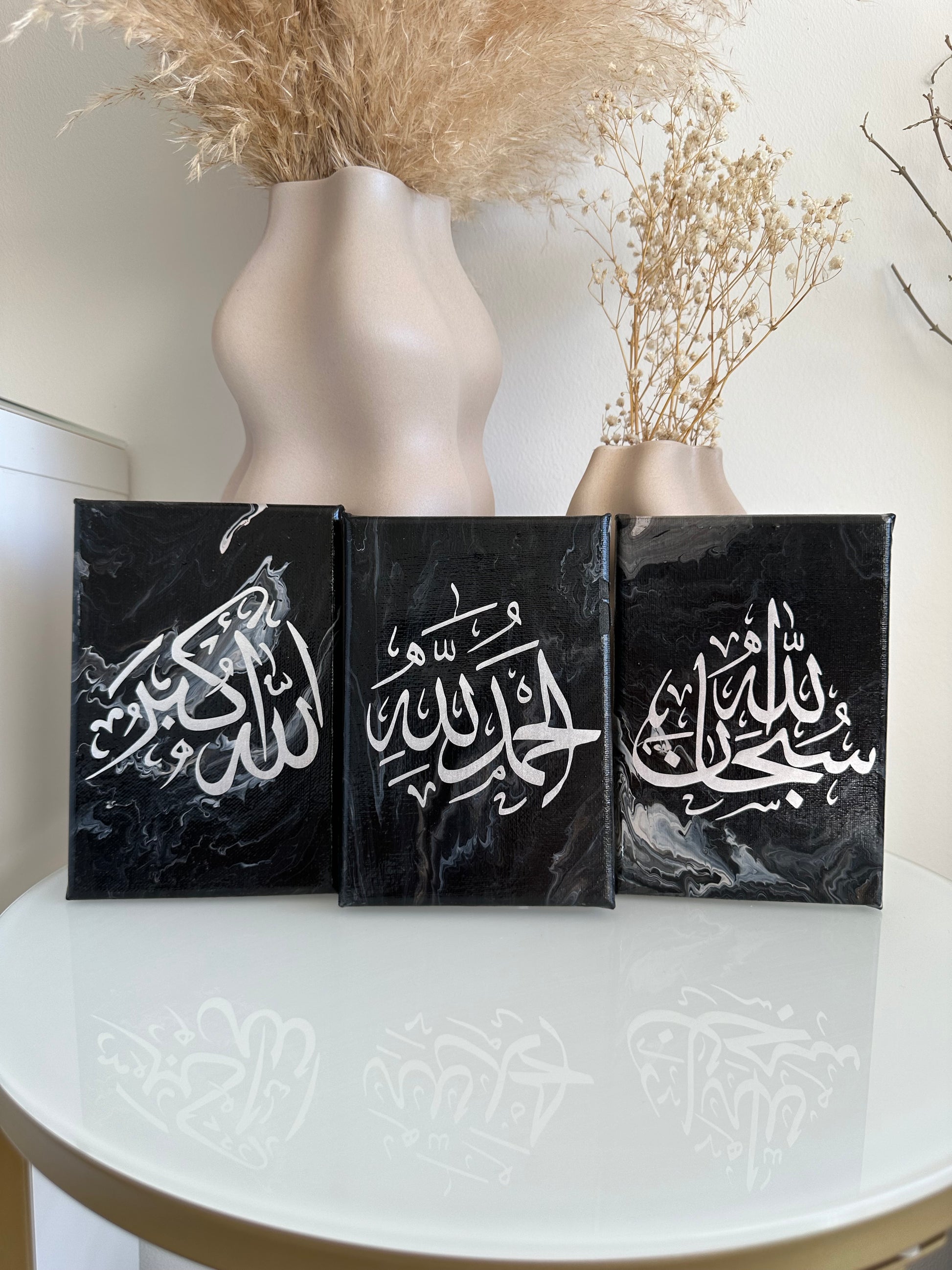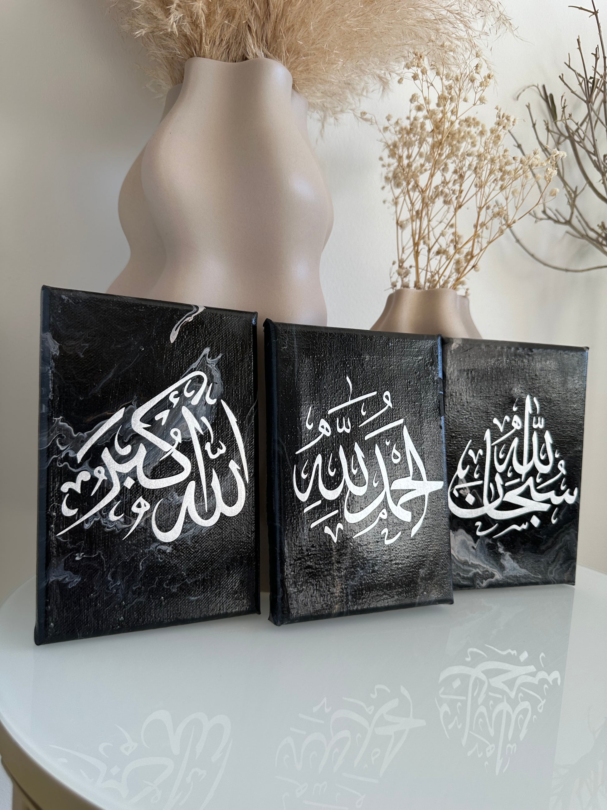3 tavlor med texterna Subhanallah, Alhamdulillah, Allahuakbar. Mått: 12x18cm. Går att hänga upp.