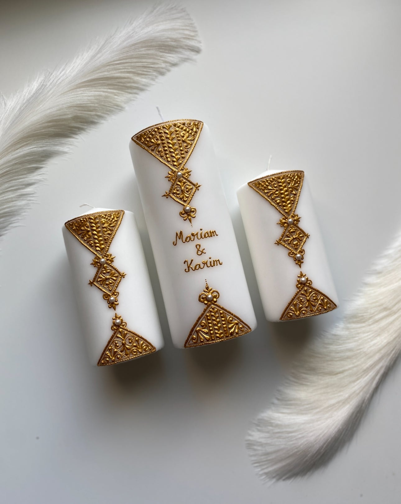 Tre blockljus med guld mönster, valfria namn. Ca 19cm / 14cm höga.