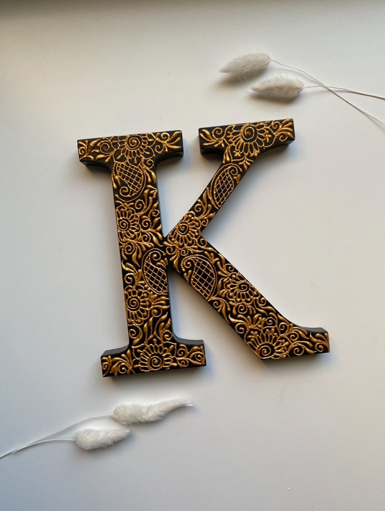 Personlig träbokstav med mönster, valfria färger. 20cm hög. Kan stå upp.